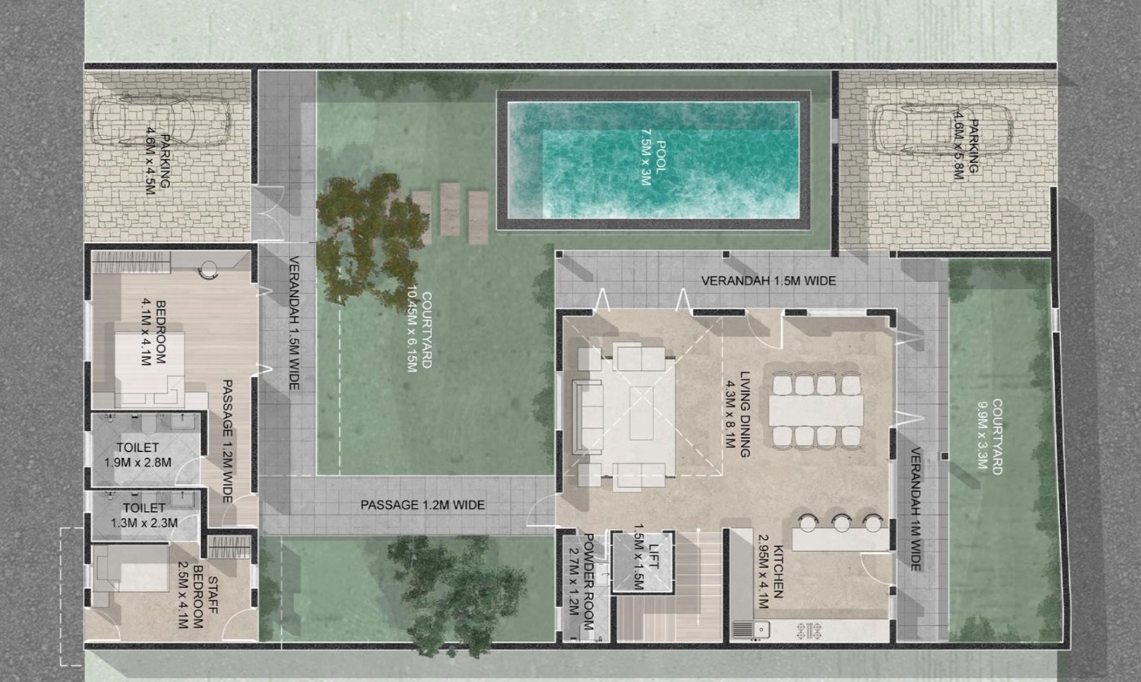 - Parking – 4.8M x 4.5M