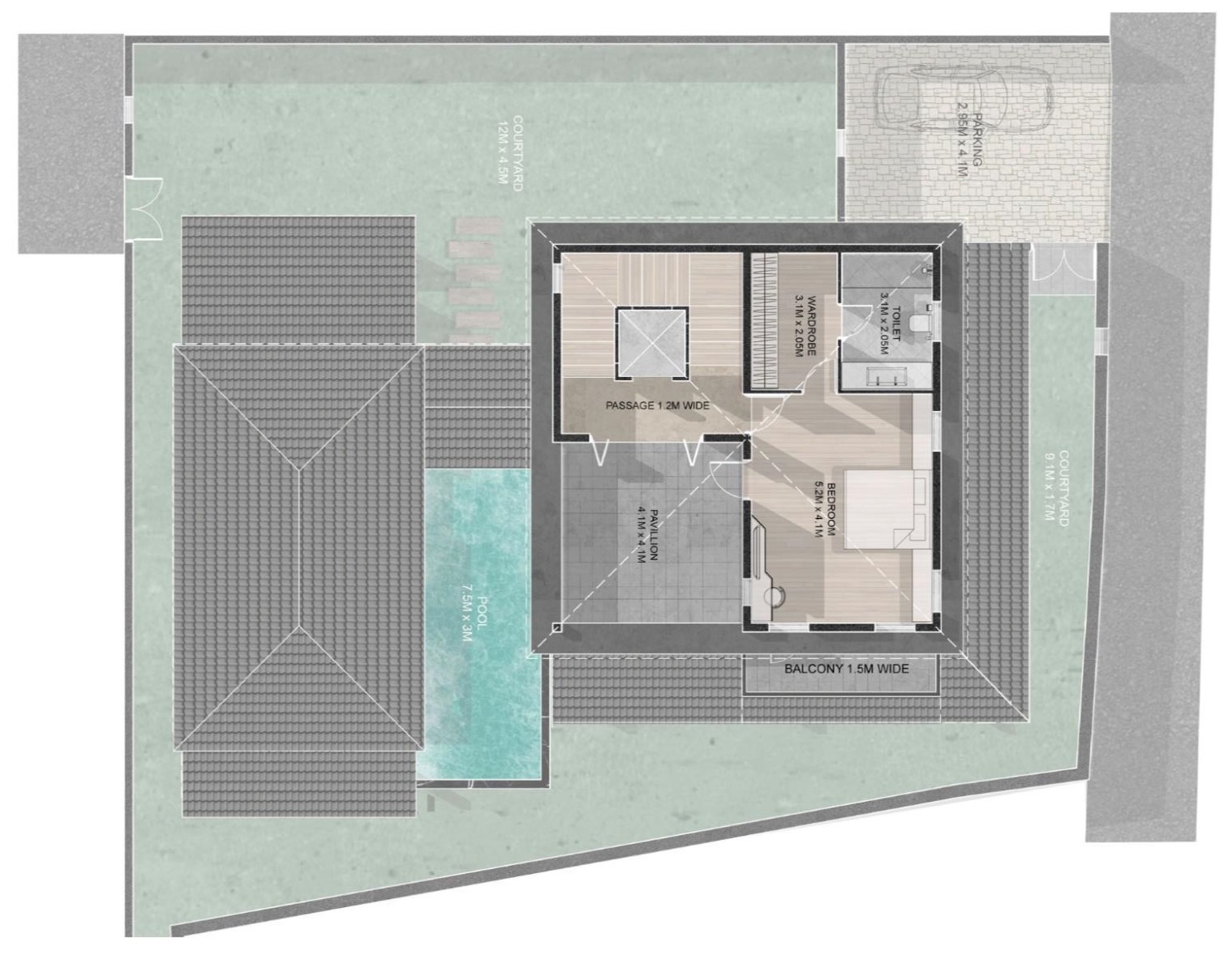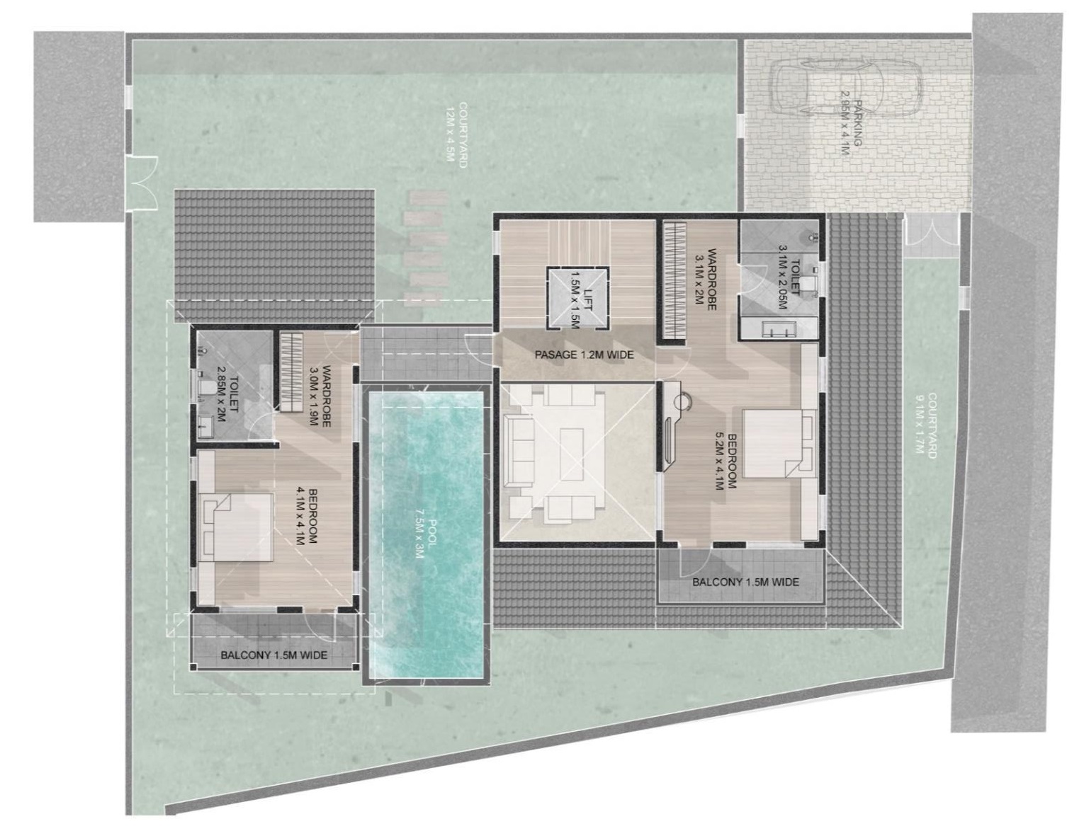 - Courtyard – 9.1M x 1.7M