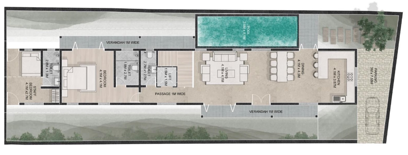 - Toilet – 2.8M x 1.8M