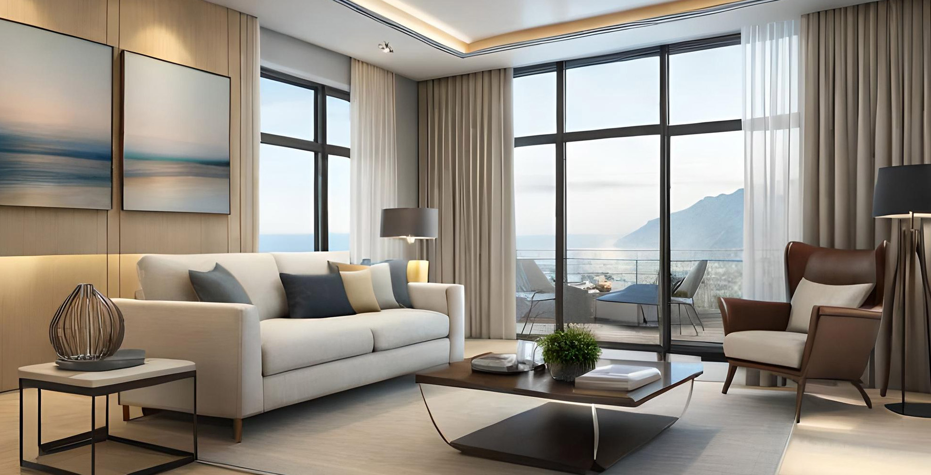 Striking, floor-to-ceiling, thermopane windows with solar shades